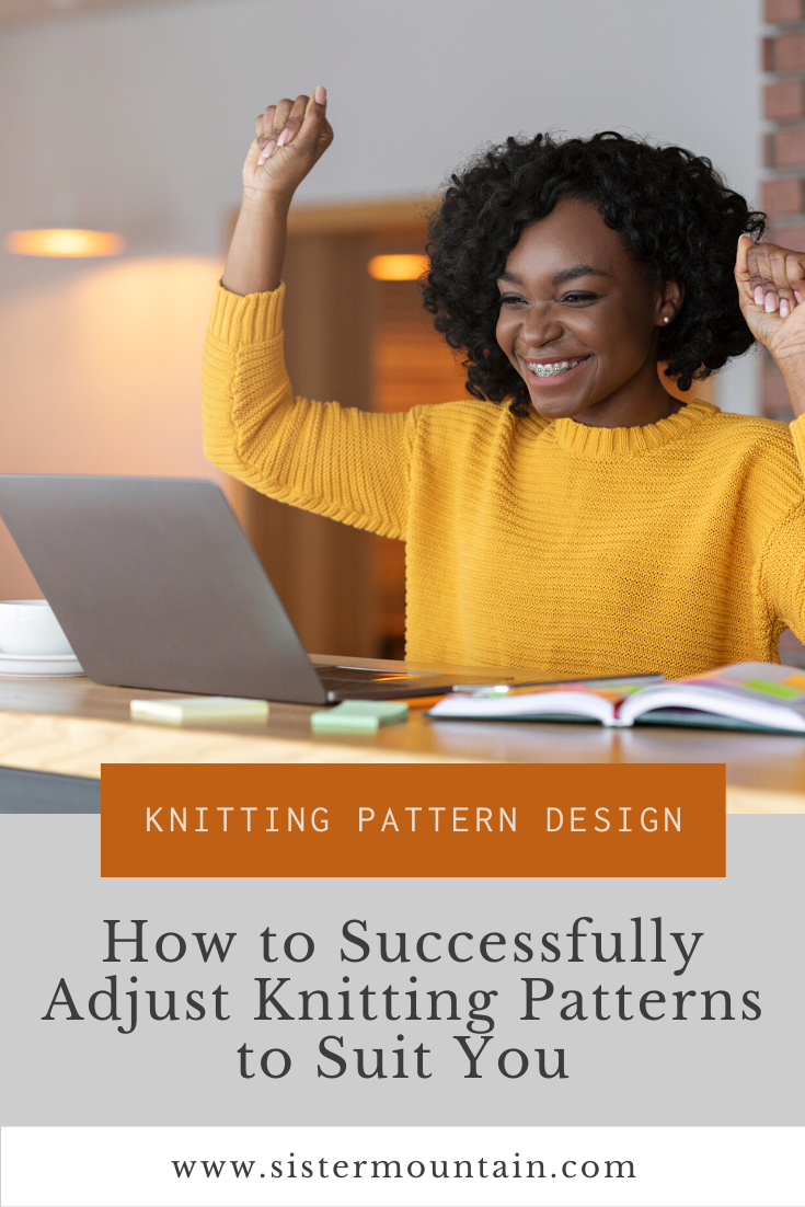 Image description: A woman in a yellow sweater is sitting at her laptop celebrating. The text says, How to Successfully Adjust Knitting Patterns to Suit You.